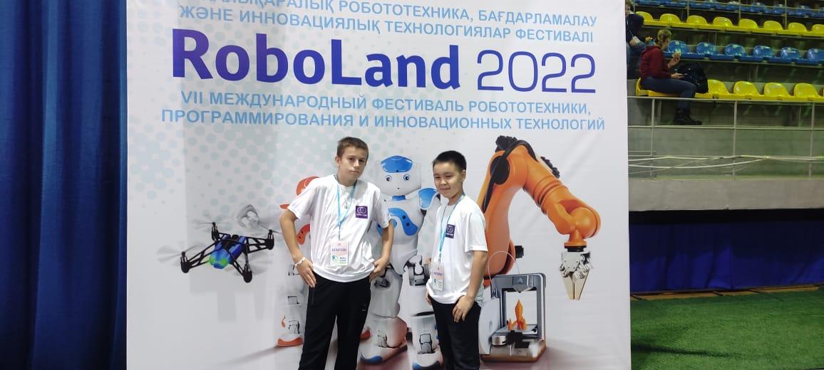 Roboland – первый и крупнейший в Казахстане проект образовательной робототехники. Инициатором фестиваля был министр просвещения Асхат Аймагамбетов. Юбилейный пятый фестиваль состоялся в обновленном формате. В программе осталось всего 13 самых актуальных и интересных категорий. На полигонах финального тура сошлись предварительно отобранные сильнейшие команды робототехников, которые порадовали зрителей зрелищными баталиями. В этом году фестиваль снова стал площадкой для обмена опытом юных инженеров и конструкторов Казахстана и зарубежья: свои проекты в 16 категориях представляли ребята из Казахстана, России, Кыргызстана, Узбекистана и Греции. Фестиваль проходил 4-5 ноября 2022 г в Караганде. Нашу школу представляли ученики Барамбаев Алихан, Кондрашов Кирилл, Березин Всеволод, руководители Әділбек А. Қ., Кожантаева Ж.А. По результатам фестиваля ребята получили сертификат участника.
