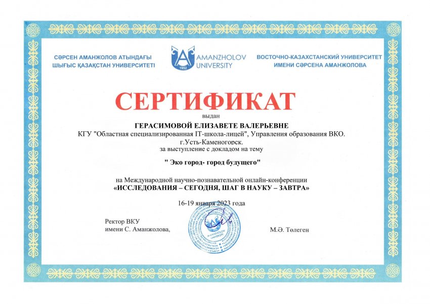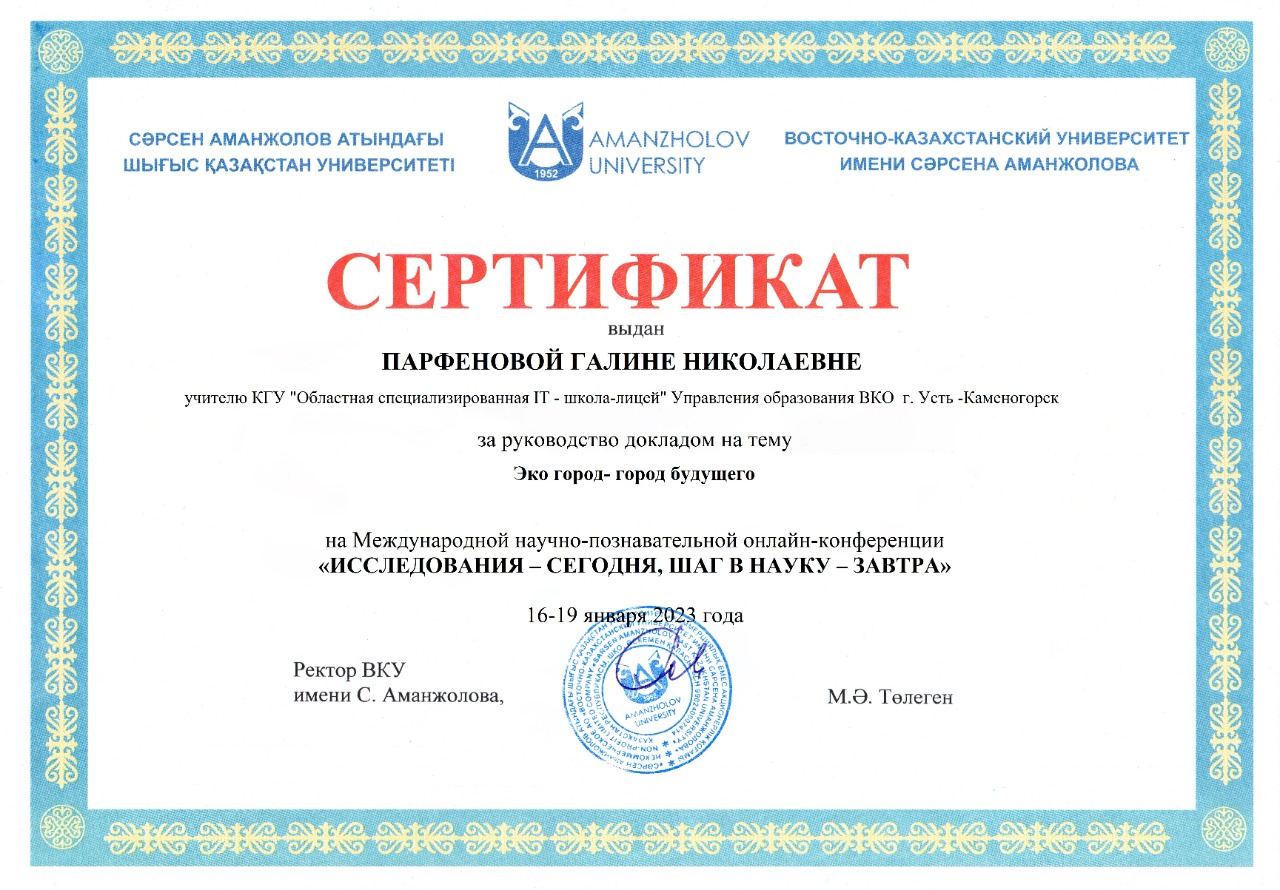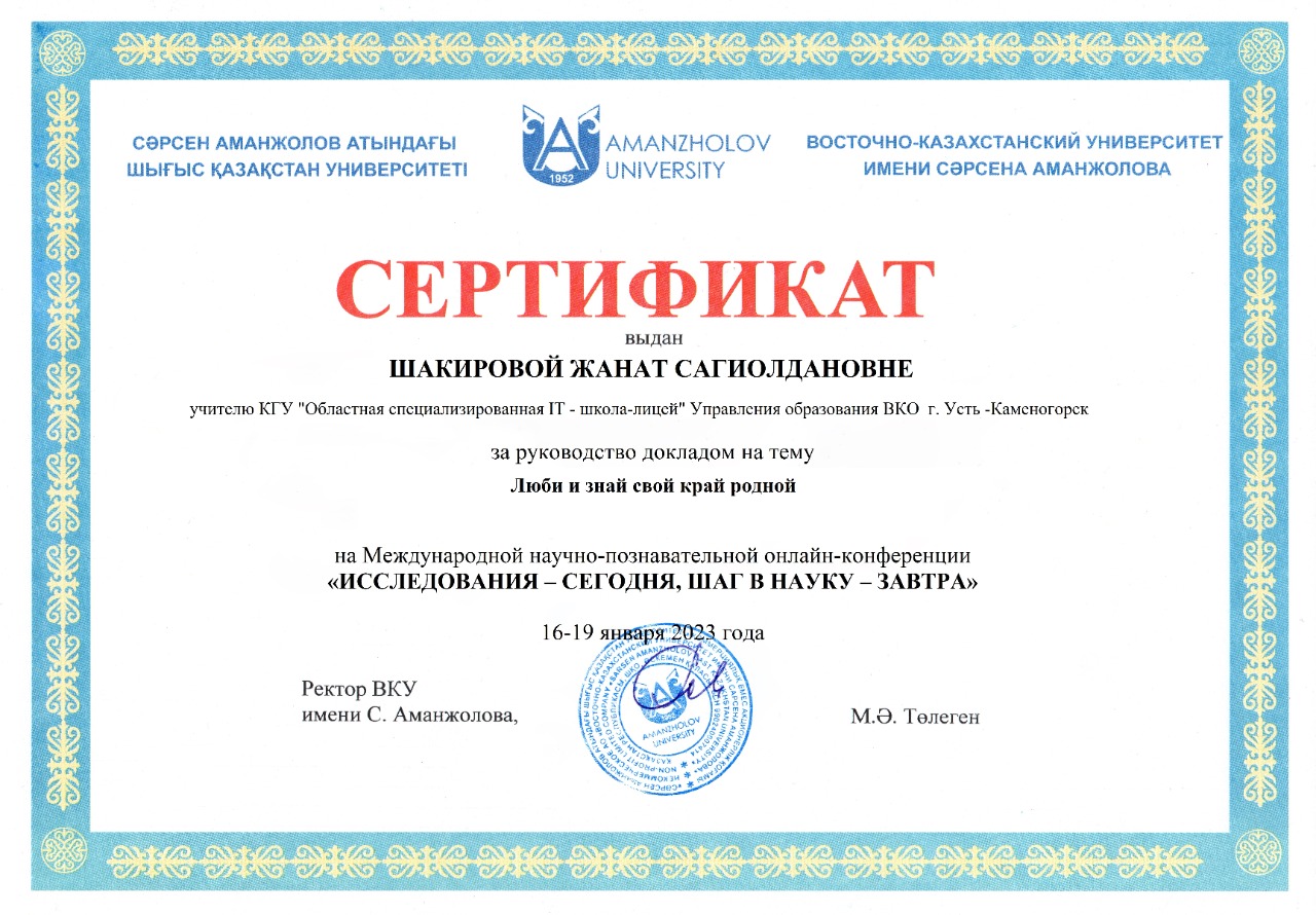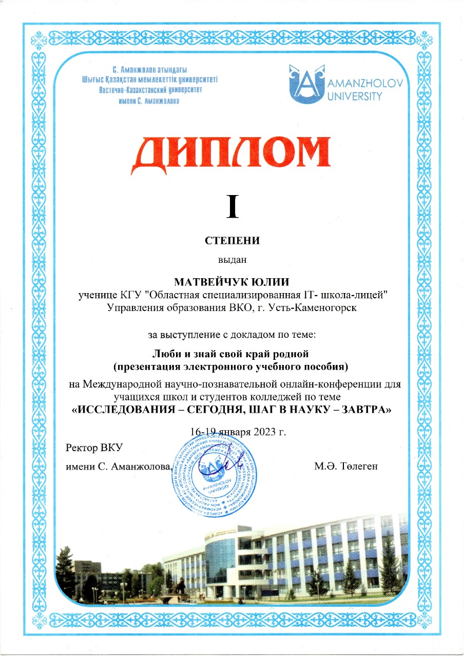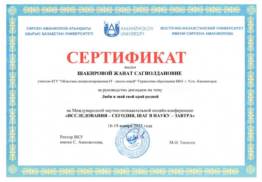 17 января 2023 г. состоялась международная научно-познавательная онлайн-конференция "Исследование - сегодня, шаг в науку - завтра", на базе ВГУ им. С. Аманжолова. Участники конференции Матвейчук Юлия 11 Б класса под руководством Шакировой Ж.С. стали обладателем диплома 1 степени с докладом "Люби и знай свой край родной (презентация электронного учебного пособия). Сертификат участника конференции получили Акентьева Полина, Герасимова Елизавета 10 А класс под руководством Парфеновой Г.Н., Шакировой Ж.С. за выступление с докладом "Эко город - город будущего". Поздравляем всех участников и желаем творческих успехов в дальнейшем.