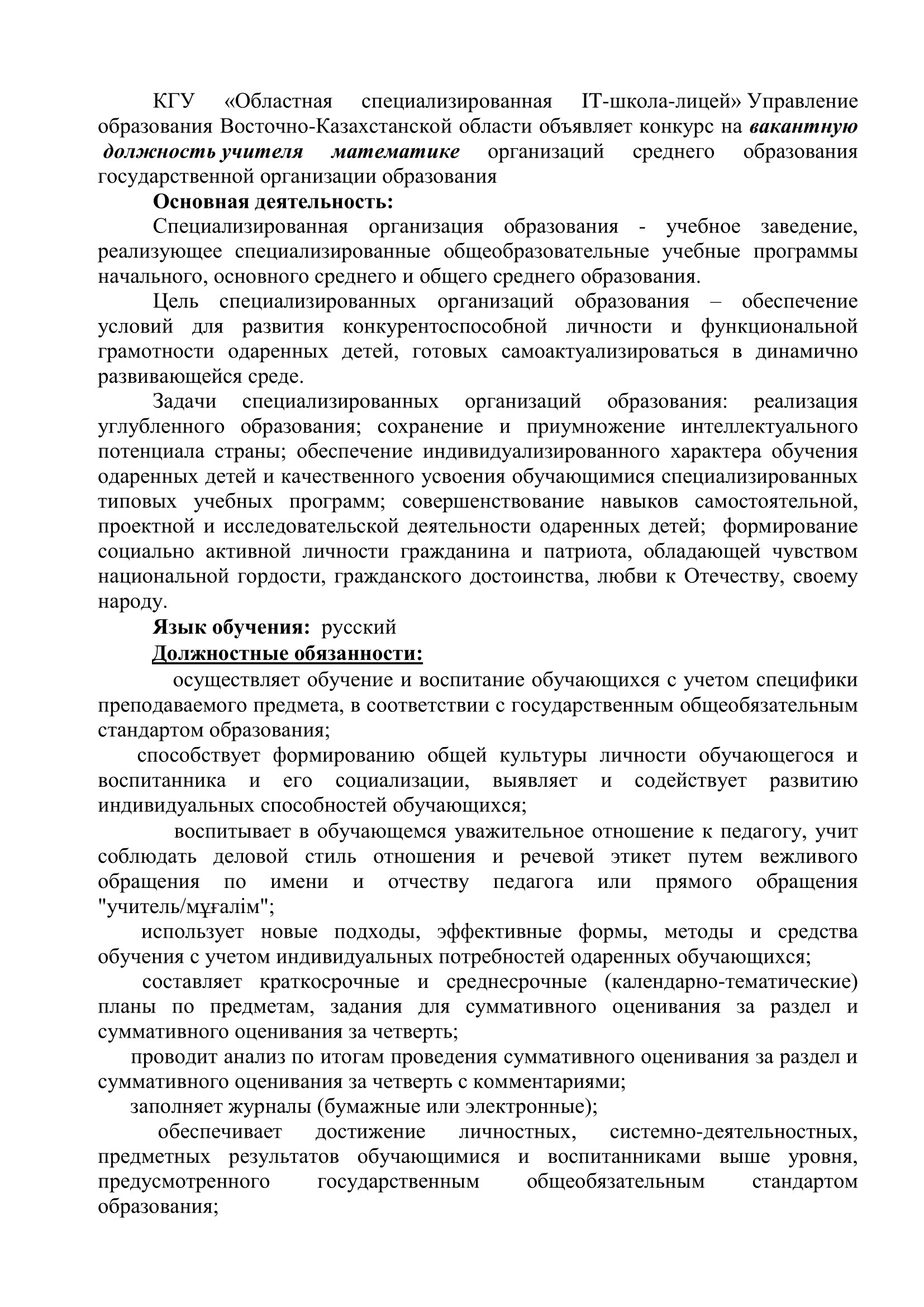 Конкурс на вакантную должность учителя математики » «IT-школа-лицей»