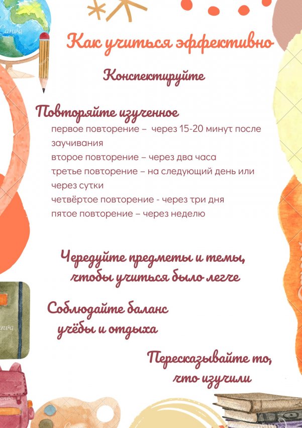 18 сентябрь 2023 0 1 2 3 4 5 Как эффективно учиться После летних каникул всегда трудно вновь начать учиться. Мы подготовили несколько простых рекомендаций о том, как сделать учебу лёгкой и эффективной.