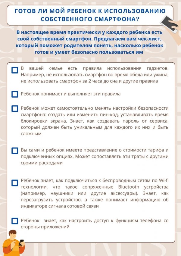 Одной из важных составляющих умения   противостоять кибербуллингу – это знать правила пользования гаджетами. Предлагаем родителям чек-лист, чтобы понять уровень готовности ребенка безопасно пользоваться гаджетами и всемирной сетью.
